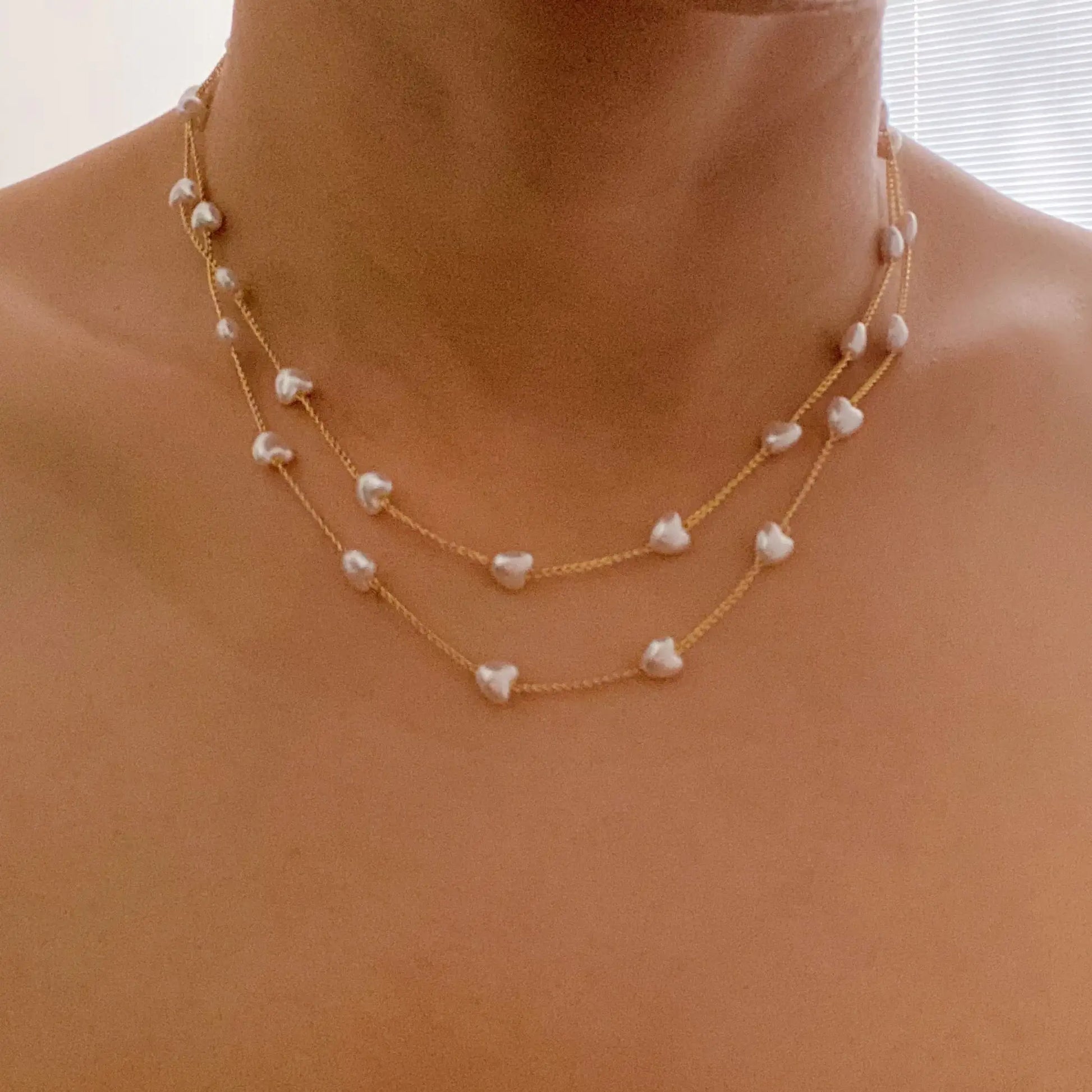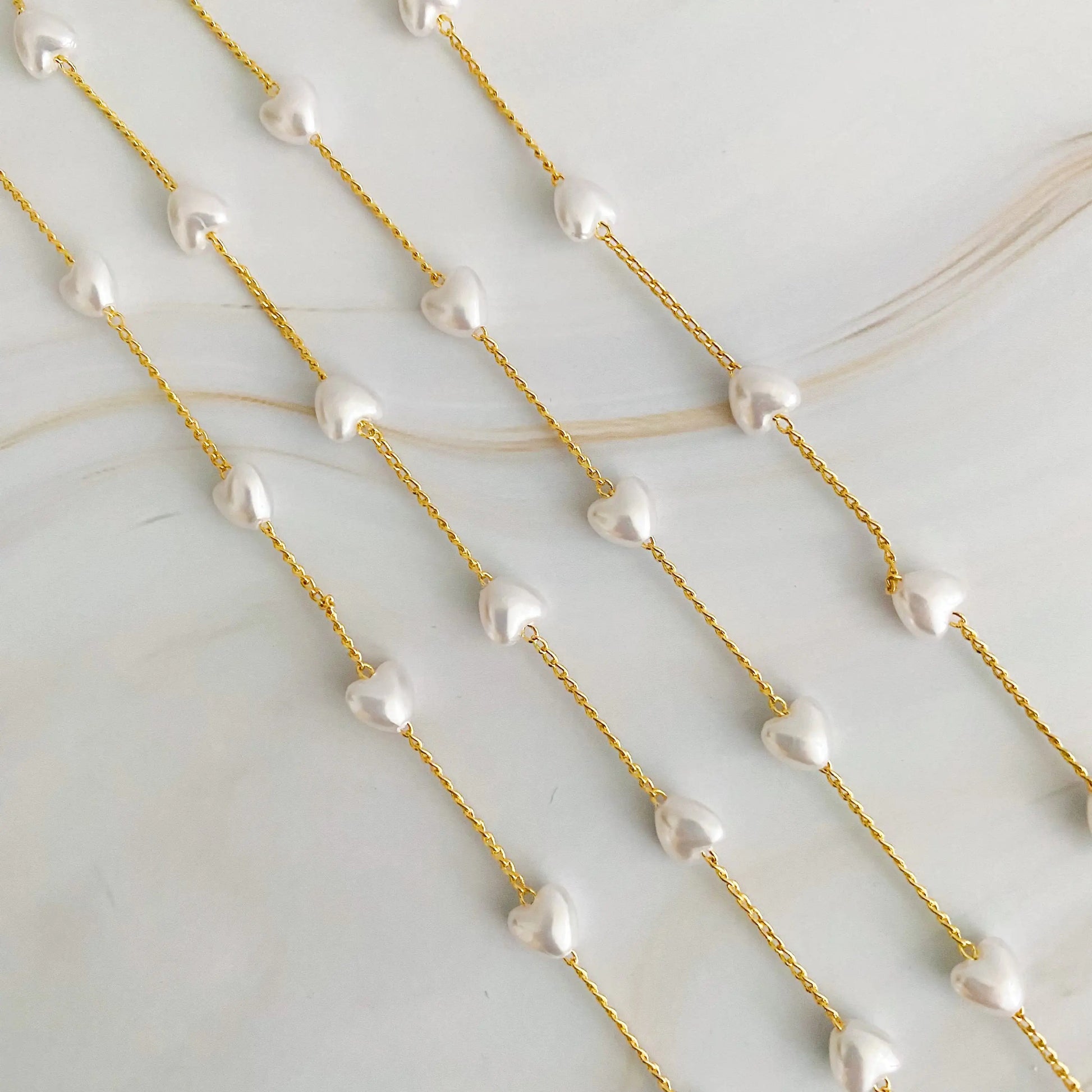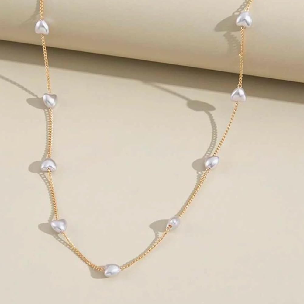 Diese atemberaubende Lange Halskette präsentiert cremige Perlenherzen, die sorgfältig entlang einer 86cm langen Kette angeordnet sind. Es ist die perfekte Wahl, um jedem Outfit eine raffinierte, dennoch verspielte Note zu verleihen.
