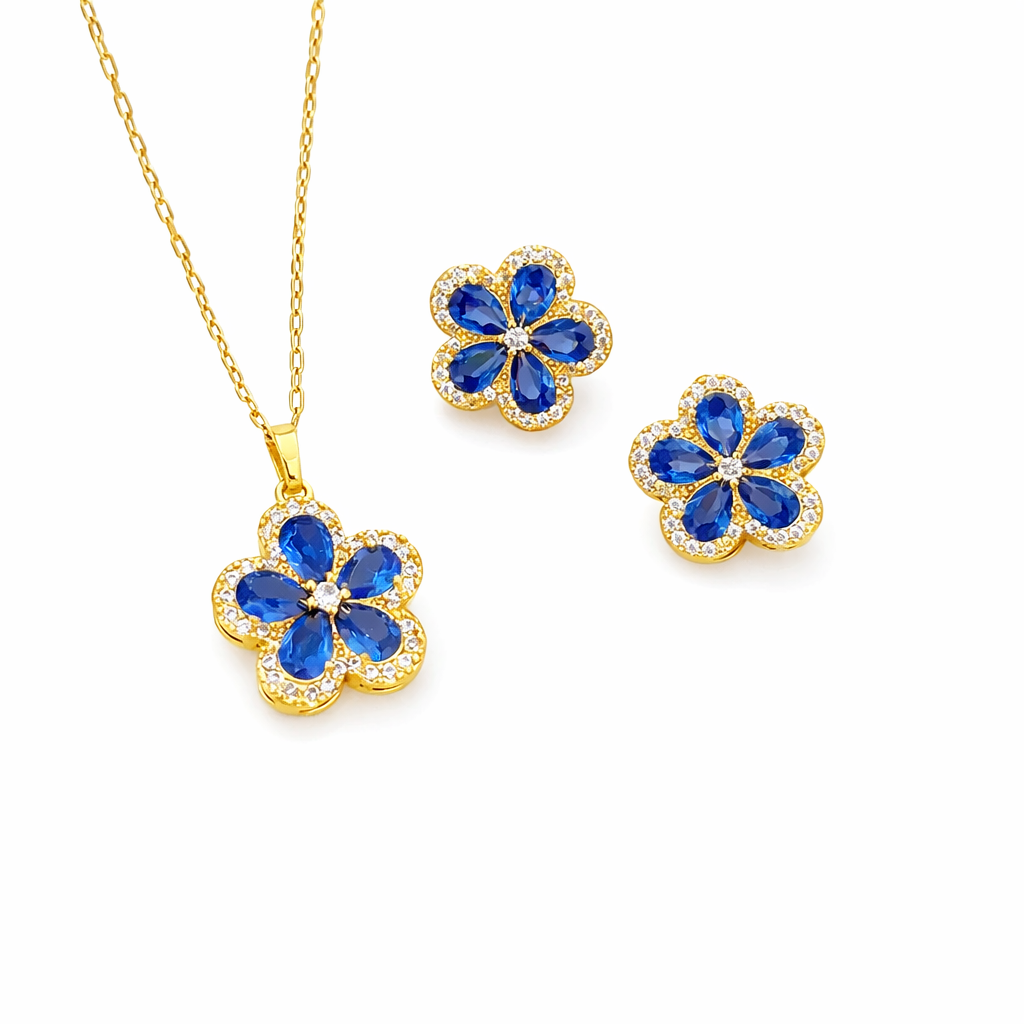 Das Set aus Halskette und Ohrringen besteht aus fein gearbeitetem Kupfer mit Mikro-Fassung und ist galvanisch veredelt für dauerhaften Glanz und Haltbarkeit.
